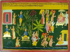 | Description / विवरण | Miniature painting based on Mahabharat - Adi parva depicting Dastak talking to Shakuntala. She tells that she is the daughter of a rishi. On the other hand Apsara Menaka is seen dancing in front of a sage to break his meditation, and she was sent by Indra. |
