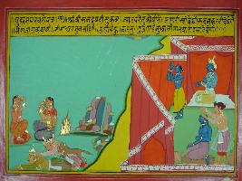 | Description / विवरण | Miniature painting based on Mahabharat depicting Krishna saying to Draupadi that the people on whom you now get angry they all will be killed by Arjun and Bhim and wives of the people will cry for the death of their husbands. |