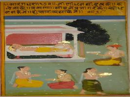 | Description / विवरण | Miniature painting based on Sarangadhar. In the upper part a man is depicted sleeping, another is massaging his legs and in the lower part three people are depicted two are sitting and one standing. |