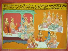 | Description / विवरण | Miniature painting based on Mahabharat - Udyam parva depicting Draupadi is telling Krishna that Duryodhan is alive till Bhim and Arjun are alive. After this they all talk with each other. |