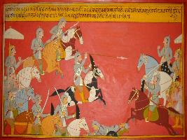 | Description / विवरण | Miniature painting based on Prithviraj Raso depicting fight between Prithviraj Chauhan and Panga army. It also depict Panga king sending more army to fight against Prithviraj. |