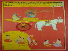| Description / विवरण | Miniature painting based on Shri Bhagwat Gita. It depicts Krishna preaching Arjun that after experiencing heaven, ones Punya get lesson and he has to take birth to Mrityu lok. This cycle goes on. |