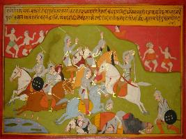 | Description / विवरण | Miniature painting based on Prithviraj Raso depicting war scene between army of Panga and army of Prithviraj. At the top left and top right dancers and musicians are shown dancing. |