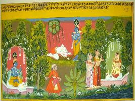 | Description / विवरण | Miniature painting based on Geet Govind where the friends says to Radha about the in frame of Krishna over creation who can centre the demon also. On the painting Krishna is depicted in the right side and Radha is seen in the left side while a demon that lying on the feet of Krishna and a man is depict in the centre of the painting. |