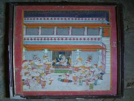 | Description / विवरण | It is a painting of Guru Goland jee. A large number of male with beard black, white with drum, holy book is shown in front of Guru. |