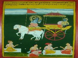 | Description / विवरण | Miniature painting based on Shri Bhagwat Gita. It depicts Krishna preaching Arjun that all the learned men who die, can seen me. All are Vasudev and mahatmas like him are not seen everywhere. |