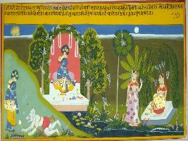 | Description / विवरण | Miniature painting based on Geet Govind depicting Radha and her friend on the left hand side of the painting. She tells to Radha that Krishna defeat a demon named Kuckkumbh, depicted on the left side of the painting, While Krishna is seen seated in the centre of the painting. |