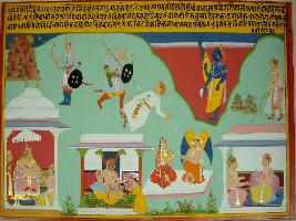 | Description / विवरण | Miniature painting based on Kadambari depicting a soldier is shown killing a man at the top right part. Below this, king is shown sitting on throne with another man in a palace. To its left Narasimha is shown killing Hiranyakashyap. To its left, a old woman is shown talking to Garuda. At the lower right, two men is shown sitting and talking. At the upper left part, king is shown leaving for forest. To its right, Lord Vishnu is depicted. |