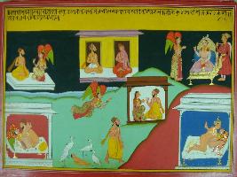 | Description / विवरण | Miniature painting based on Mahabharat - Adi parva. It depicts how king Prata falls love for Shakuntala and she gives birth to a child. |
