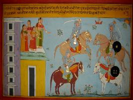 | Description / विवरण | Miniature painting based on Prithviraj Raso depicting four women standing on a palace on the other side four men are depicted. 2 men are depicted fighting on horseback while two men are playing Nagada. |