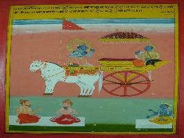 | Description / विवरण | Miniature painting based on Shri Bhagwat Gita. It depicts Krishna preaching Arjun that he who is liberal and knowledgeable in his soul he would get uttam gati. |