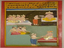 | Description / विवरण | Miniature painting based on Sarangadhar depicting four headed Brahma seated and handing a granth to a young devotee while four Devtas are seated in front of them. Below them, a king is handing a granth to another person and three sages are watching them. |