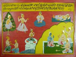 | Description / विवरण | Miniature painting based on Mahabharat - Udyam parva depicting Krishna praising the bravery of Bhim by saying that he can climb the tree, run and sleep on the ground, thus he does not get luxury. The Bhim says that he has that much of strength that he can kill Duryodhan if he will come in front of him. |