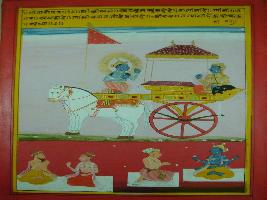 | Description / विवरण | Miniature painting based on Shri Bhagwat Gita. It depicts Krishna preaching Arjun that the follower who is intellectual is his favourites and they only attain him. |