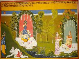 | Description / विवरण | Miniature painting based on Geet Govind depicting Radha and her friend where Radha s friend asks about the wind that passes my freely. While a demon also seen in the rishi side of the painting. |