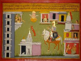 | Description / विवरण | Miniature painting based on Prithviraj Raso. Prithviraj is depicted in the city of Kannauj, where he have come to take Sanjogita. He is depicted Surrounded by palace, temples and houses. Lord Brahma is depicted on the upper part. |