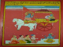 | Description / विवरण | Miniature painting based on Shri Bhagwat Gita. It depicts Krishna preaching Arjun that four types of people worshipped him those are i sick men, ii who wants to learn iii who wants wealth iv intellectuals. |
