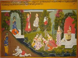 | Description / विवरण | Miniature painting based on Geet Govind depicting friends of Radha praising the beauty of Krishna in front of Radha. Krishna is depicted at the upper right part sitting in a garden. At the lower right Krishna killing a demon. Gopis are depicted at the centre loosing their consciousness in the love of Krishna. |