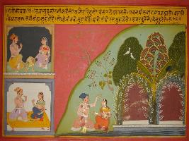 | Description / विवरण | Miniature painting based on Prithviraj Raso. king is depicted here talking to Sohmirni about different seasons and the seasons the Shishir, Vasant are depicted. |