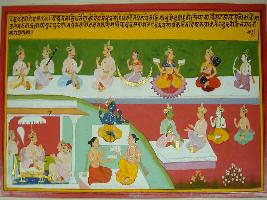 | Description / विवरण | Miniature painting based Kadambari depicting Ram, Saraswati, Lakshmi moon God and 4 kings from Right to left on upper part. On lower right part king seated on throne and talking to his ministers. Lord Vishnu seated on mat above two Brahman. On lower left part two king talking. |