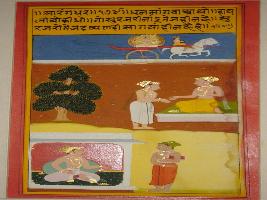 | Description / विवरण | Miniature painting based on Sarangadhar depicting sun god seated on his chariot. In the central part, a king is donating to a young man. At the lower part a man is seated and watching a young boy, who is standing in front him. |
