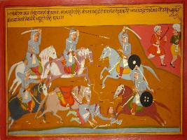 | Description / विवरण | Miniature painting based on Prithviraj Raso depicting Samant a noble of Prithviraj Chauhan defeating and crushing the force of Jaichand. |