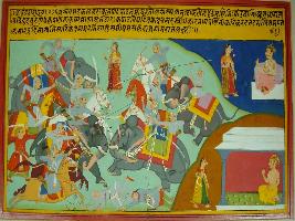 | Description / विवरण | Miniature painting based on Kadambari depicting a battle scene and in the left side a king and his queen is seen where king is telling the story of that battle to his queen. |