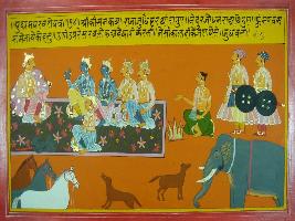 | Description / विवरण | Miniature painting based on Mahabharat - Udyam parva depicting Krishna telling Yudhisthir that Yudhisthir has all good qualities and Duryodhan has all bad qualities but in the way an elephant ignore a people, he should ignore the bad qualities of Duryodhan. |