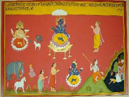 | Description / विवरण | Miniature painting based on Kadambari depicting Vishnu in the centre and a man is praying him while Brahma is seen in the right side and Shiv is seen in the left below corner. The painting depicts the worshipping of Brahma Vishnu Mahesh. |