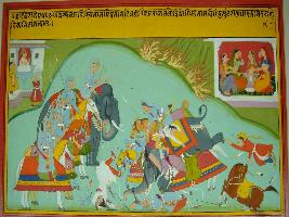 | Description / विवरण | Miniature painting based on Kadambari depicting a battle seen where may soldier are killed and five soldiers are watching them. In the right up corner one messenger informing the battle incident while some females are seen in a sad mood in the right up corner. |