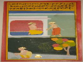 | Description / विवरण | Miniature painting based on Sarangadhar depicting a man standing with folded hands in front of a seated king. Below them a man is trying to get water from a based bed River . |
