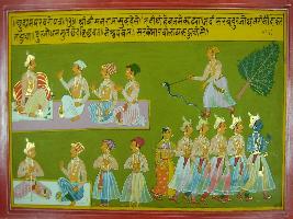 | Description / विवरण | Miniature painting based on Mahabharat - Udyam parva depicting Krishna telling Yudhisthir that Duryodhan in the root of Kaurava tree, and in the way one kill snakes, Duryodhan should be killed. The lower right depict people are criticizing Duryodhan. |