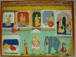 | Description / विवरण | Miniature painting based on Kadambari depicting a king in different posture like who is paint, in something position, reading playing musical instrument, and resting posture. Again the king is seen sitting on throne in front of an elephant. |