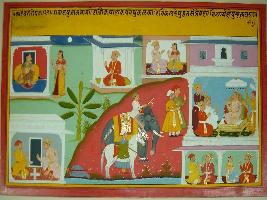 | Description / विवरण | Miniature painting based on Kadambari depicting a king on throne, flanked by his people at the left part. Below them two men and a woman are depicted talking with each other. A messenger is depicted outside the palace of the king. In lower right part two nobles are depicted playing chaupar. On the upper right part, a queen is depicted in the balcony with an attendant. In the upper centre, a man and a woman is depicted talking to each other. |