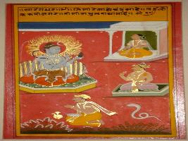 | Description / विवरण | Miniature painting based on Sarangadhar. Shiv is depicted sitting on lion skin over a platform and he is surrounded by three people, one sitting on ground, one on a platform and one in a building. |