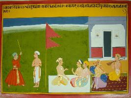 | Description / विवरण | Miniature painting based on Kadambari depicting a Brahman standing nearby flag dhwaja . Beside it three men seated on mat, talking to each other. Two musicians playing sitar at lower left side. |