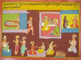 | Description / विवरण | Miniature painting based on Mahabharat - Udyam parva depicting six needs for six different types of person like-carelessness of man is needed by a theif, ill person need vaidya, justy men need women, yachak need projects, king is needed for, solving marrels, and fools need Pundits to learn. |