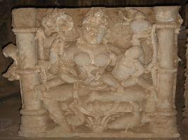 | Description / विवरण | An independent sculpture of eight armed mother address Brahmani in a niche, flanked by two celestial figures on upper part. She is sitting in Lalitasana on a lotus. Attributes from the right below are, i Lotus ii Rosary iii Lotus flower iv Arrow v Kalash vi Bow vii Kamandal viii Holding a child. She is wearing a jata mukuta , earrings, necklaces, armlet, bracelets, girdle and anklets. There are two birds near her feet. |