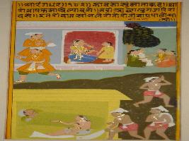 | Description / विवरण | Miniature painting based on Sarangadhar depicting a mother talking to his son, to their left side some women are seated under a tree. Below them a family, with the man on the bed, is depicted and three farmers are seen near them. |
