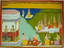 | Description / विवरण | Miniature painting based on Kadambari depicting two females standing under a palatial balcony and talking to each other. At the lower part two groups of priest are depicted doing yagna for the marriage depicted at the upper left side. A devpurush is depicted at the centre, in front of whom a man is standing with folded hands. |