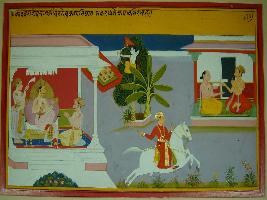 | Description / विवरण | Miniature painting based on Kadambari depicting sitting on throne with minister in a palace at extreme right. To its left, Kamdev is shown sitting on tree. A noble shown sitting over horse. At the right noble is talking to Brahman. |