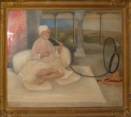 | Description / विवरण | Portrait of Maharaja Ranjit Singh ji. He is depicted in seated position on a couch and smoking hookah. It is framed with glass with wooden border. |