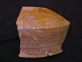 | Description / विवरण | It is a red ware potsherd which is having a out-turned rim and flat base upper portion of its body is designed with wavy and horizontal lines. Also on the body a very prominent ridge is there on which cut designs are executed. It belongs to wheel made pottery, and well fired. also it belongs to red slip ware found as associated ware of O.C.P. culture. |