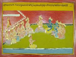 | Description / विवरण | Miniature painting based on Mahabharat - Udyam parva depicting Sanjay sitting with Yudhisthir in his Sabha. |