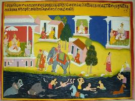 | Description / विवरण | Miniature painting based on Kadambari depicting elephant, crocodile, horse and men taking bath in a river. At the upper level, Vidisha city is depicted with king Dhanya sitting with his minister in a palace at extreme right. |