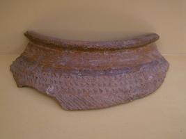 | Description / विवरण | Sherd is an upper portion of vase having part of rim, three incised notch line designs in horizontal pattern, also black coloured horizontal line design along with other incised line designs. Its slip is flaking. It belongs to slip ware fund as associated ware of O.C.P. culture. It is wheel made and well fired. |