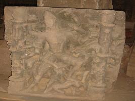 | Description / विवरण | An independent sculpture depicting Shiva sitting on Nandi, he is depicted 8 armed holding damaru, shield, conch and dagger are clearly visible, rest attributes are broken, the face of Shiva is mutilated, below a defaced head of Andhakasur probably is visible, his arms and legs are missing. |