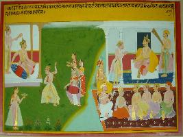 | Description / विवरण | Miniature painting based on Kadambari. It is divided into 2 parts. In right part, the king is enjoying the dance and music performed by dancers and musicians. In left part, king is seated in his court with court persons and Brahmans. |