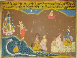 | Description / विवरण | Miniature painting based on Geet Govind depicting Vishnu and Lakshmi that sitting on Padmasana in the right side of the painting where a Brahma informing them that his Krishna incarnation defeated Kalinga and established peace on the creation. On the painting Krishna is seen in the right corner and two sages one seen in the centre. |