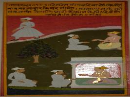 | Description / विवरण | Miniature painting based on Sarangadhar depicting a man is shown wandering from place to place and talking to a seated man. |